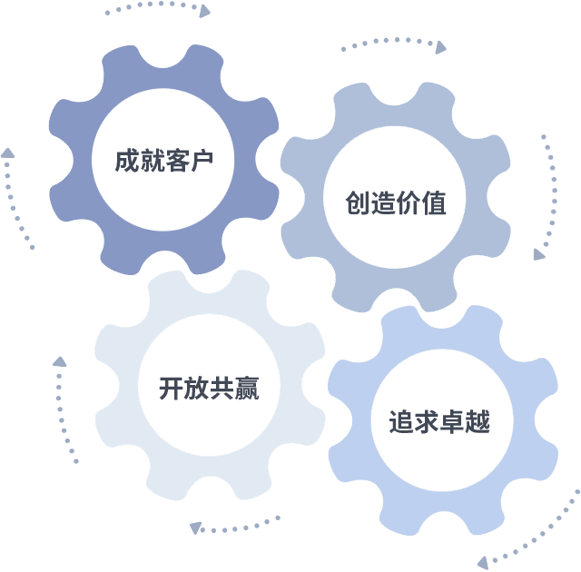 成就客户是一切决策的出发点,,,,创造价值是衡量所有工作的标准,,,,追求卓越是我们做事做人的态度,,,开放共赢是我们的格局也是最终的结果。。价值观的齿轮环环相扣,,推动着组织里的每个人不断向前。。。。